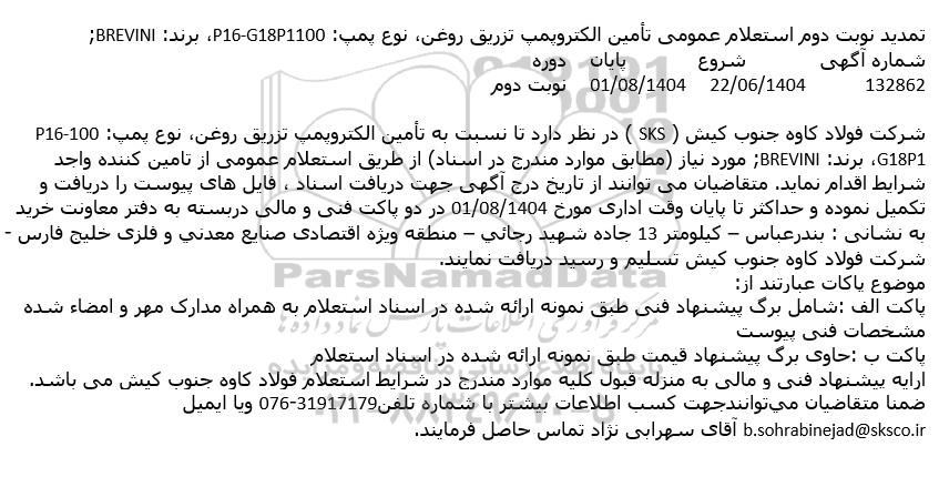 شرکت فولاد کاوه جنوب کیش ( SKS ) در نظر دارد تا نسبت به تأمین الکتروپمپ تزریق روغن، نوع پمپ P16-G18P1100 برند BREVINI مورد نیاز (مطابق موارد مندرج در اسناد) از طریق استعلام عمومی از تامین کننده واجد شرایط اقدام نماید. متقاضیان میتوانند از تاریخ درج آگهی جهت دریافت اسناد ، فایلهای پیوست را دریافت و تکمیل نموده و حداکثر تا پایان وقت اداری مورخ 1404.8.1 در دو پاکت فنی و مالی دربسته به دفتر معاونت خرید به نشانی : بندرعباس - کیلومتر 13 جاده شهید رجائی - منطقه ویژه اقتصادی صنایع معدنی و فلزی خلیج فارس - شرکت فولاد کاوه جنوب کیش تسلیم و رسید دریافت نمایند.