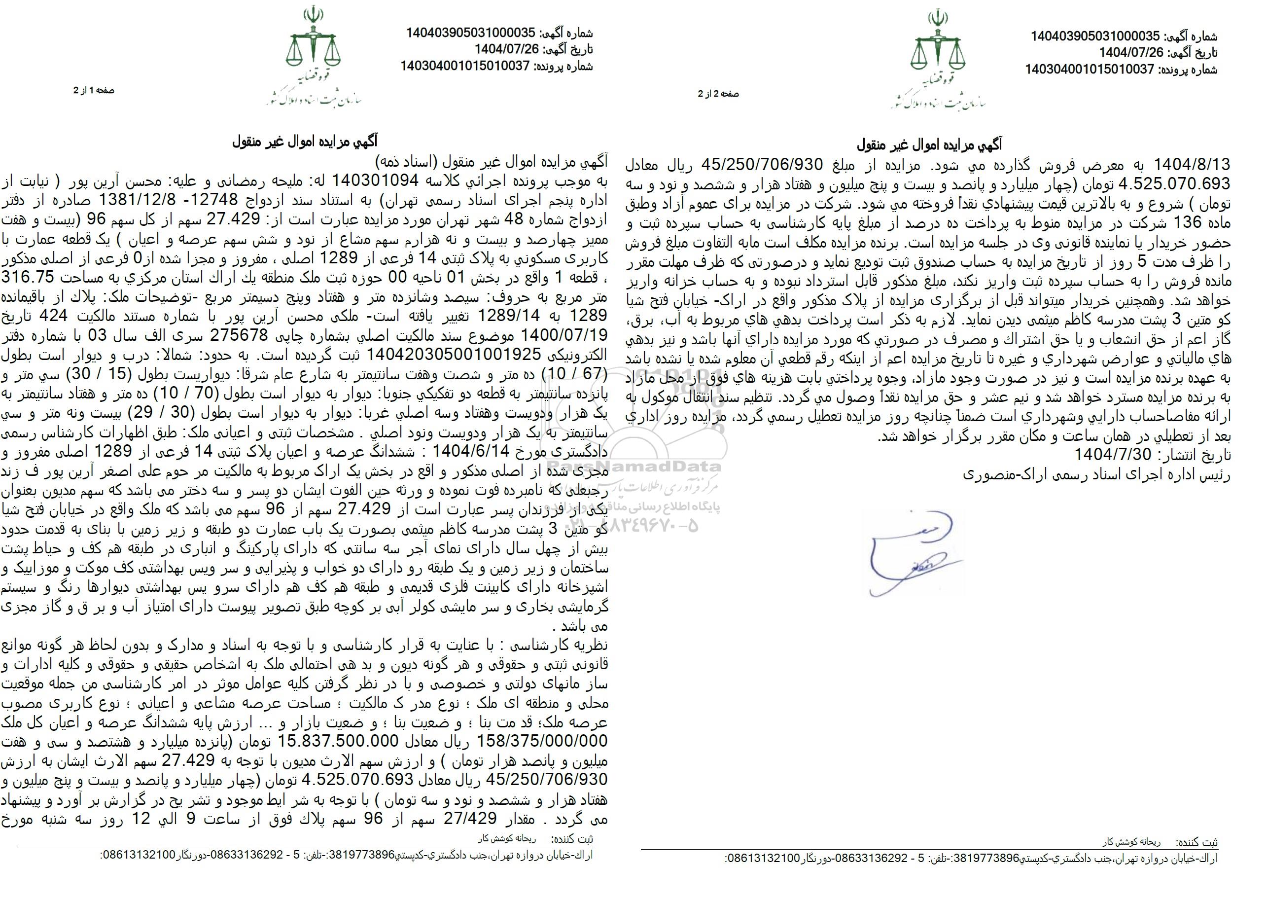 آگهی مزایده اموال غیر منقول (اسناد ذمه) به موجب پرونده اجرائی کلاسه 140301094 له ملیحه رمضانی و علیه محسن آرین پوز ( نیابت از اداره پنجم اجرای اسناد رسمی تهران به استناد سند ازدواج 12748 - 1381.12.8 صادره از دفتر اردواج شماره 48 شهر تهران مورد مزایده عبارت است از 27.429 سهم از کل سهم 96 (بیست و هفت ممبر چهارصد و بیست و نه هزارم سهم مشاع از نود و شش سهم عرصه و اعیان ) یک قطعه عمارت با کاربری مسکونی به پلاک ثبتی 14 فرعی از 1289 اصلی، مغرور و مجزا شده از 0 فرعی از اصلی مذکور ، قطعه 1 واقع در بخش 01 ناحیه 00 حوره ثبت ملک منطقه یک اراک استان مرکزی به مساحت 316.75 متر مربع به حروف سیصد و شانزده متر و هفتاد و پنج دسیمتر مربع توضیحات ملک: پلاک از باقیمانده 1289 به 1289/14 تغییر یافته است ملکی محسن ارین پور با شماره مستند مالکیت 424 تاریخ 1400.07.19 موضوع سند مالکیت اصلی بشماره چاپی 275678 سری الف سال 03 با شماره دفتر الکترونیکی 140420305001001925 ثبت گردیده است. به حدود شمالا درب و دیوار است بطول (67/ 10) ده متر و شصت و هفت سانتیمتر به شارع عام شرقا دیواریست بطول (15 / 30) سی متر و پانزده سانتیمتر به قطعه دو تفکیکی جنوبا دیوار به دیوار است بطول (70 / 10) ده متر و هفتاد سانتیمتر به یک هزار و دویست و هفتاد و سه اصلی غربا دیوار به دیوار است بطول (30/29) بیست و نه متر و سی سانتیمتر به یک هزار و دویست و نود اصلی - مشخصات ثبتی و اعیانی ملک طبق اظهارات کارشناس رسمی دادگستری مورخ 1404.6.14 : ششدانگ عرصه و اعیان پلاک ثبتی 14 فرعی از 1289 اصلی مفرور و مجری شده از اصلی مذکور واقع در بخش یک اراک مربوط به مالکیت مر حوم على اصغر ارین پوری زند رجبعلی که نامبرده فوت نموده و ورنه حین الفوت ایشان دو پسر و سه دختر میباشد که سهم مدیون بعنوان یکی از فرزندان پسر عبارت است از 27.429 سهم از 96 سهم میباشد که ملک واقع در خیابان فتح شیا کو متین 3 پشت مدرسه کاظم میتمی بصورت یک باب عمارت دو طبقه و زیر زمین با بنای به قدمت حدود بیش از چهل سال دارای نمای آجر سه سانتی که دارای پارکینگ و انباری در طبقه هم کف و حیاط پشت ساختمان و زیر زمین و یک طبقه رو دارای دو خواب و پذیرایی و سرویس بهداشتی کف موکت و موزاییک و اشپزخانه دارای کابینت فلزی قدیمی و طبقه هم کف هم دارای سرویس بهداشتی دیوارها رنگ و سیستم گرمایشی بخاری و سرمایشی کولر آبی بر کوچه طبق تصویر پیوست دارای امتیاز آب و برق و گار مجری می باشد.