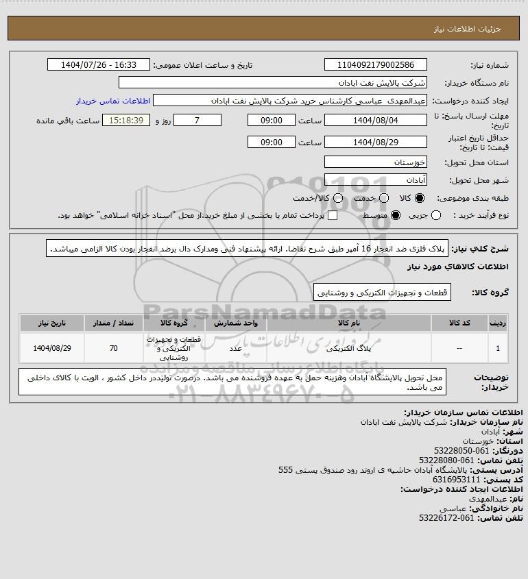 شرح کلی نیاز: پلاک فلزی ضد انفجار 16 آمپر طبق شرح تقاضا. ارائه پیشنهاد فنی ومدارک دال برضد انفجار بودن کالا الزامی میباشد.