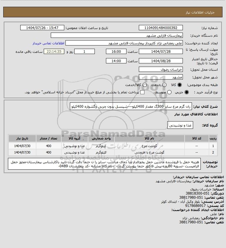 شرح کلی نیاز: ران گرم مرغ سایز 300گ مقدار 400کیلو----شینسل بدون چربی وگشواره 400کیلو