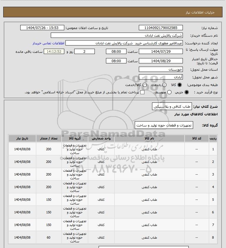 استعلام بها و موضوع استعلام استعلام طناب کنافی و پلاستیکی به اطلاع کلیه شرکتها و افراد متخصص واجد شرایط میرساند، آگهی گذار در نظر دارد از طریق استعلام بها، نسبت به انتخاب و دریافت پیشنهادات اقدام نماید. این استعلام با کد آگهی ثبت شده در سامانه خبرگزاری پارس نماد : 9715672 منتشر شده است. مشخصات استعلام : تاریخ شروع استعلام: 1404/07/26 آخرین مهلت ارسال پیشنهاد قیمت : 1404/07/29 و محل اجرای پروژه : استان خوزستان میباشد. استعلام قیمت مورد درخواست : استعلام طناب کنافی و پلاستیکی با دستهبندیهای تخصصی و گروه های مرتبط : ابزار و یراق آلات, نخ و پارچه, قطعات پلاستیکی, تجهیزات نفت و گاز, استعلام اطلاع رسانی میگردد.