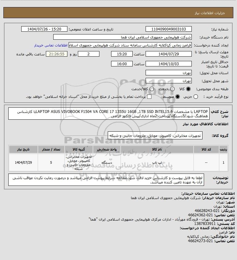| 1 | -- | لپ تاپ | دستگاه | تجهیزات مخابراتی، کامپیوتر، موبایل، ملزومات جانبی و شبکه | 5 | 1404/07/29 |
