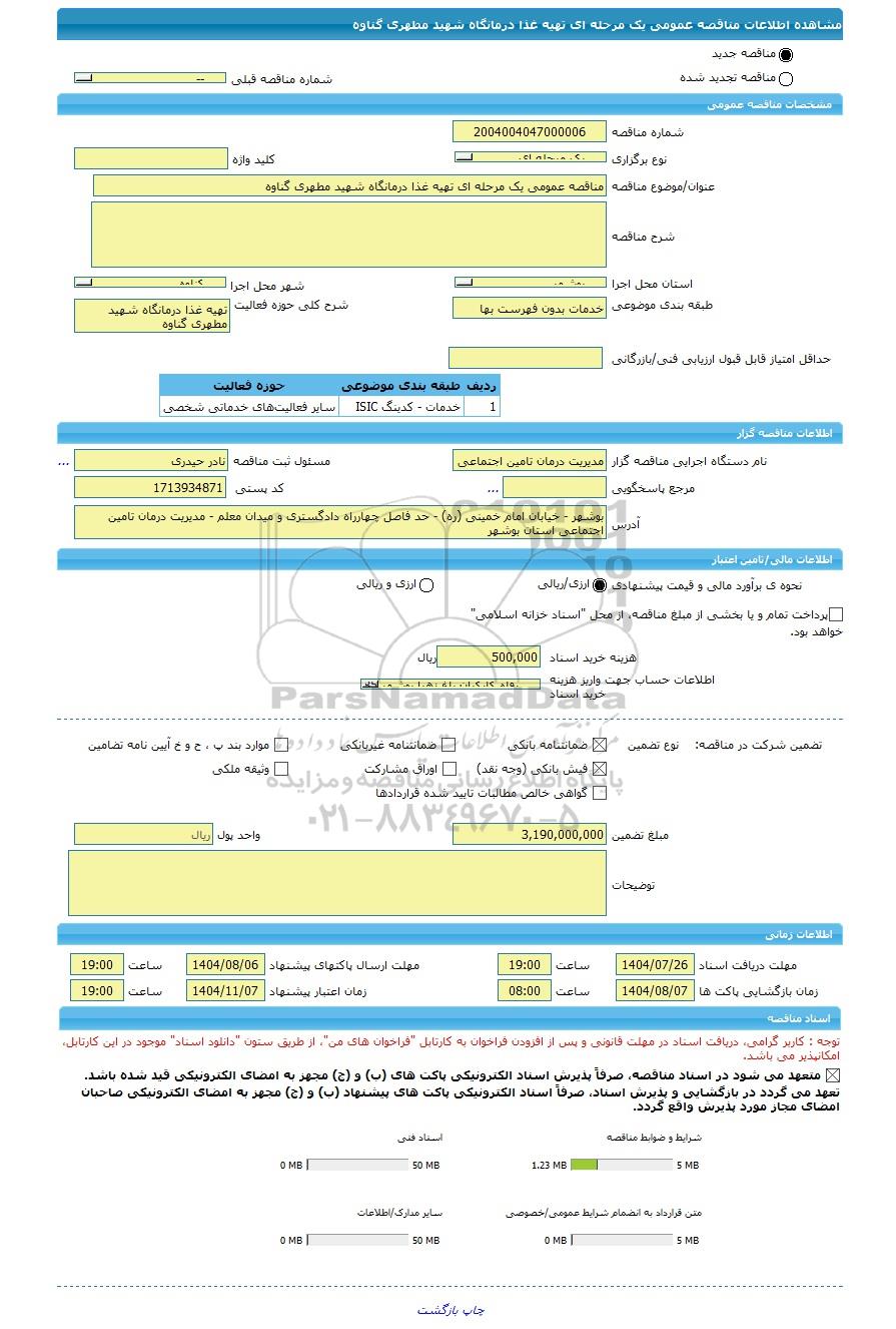 2 مناقصه عمومی انجام خدمات تهیه، طبخ، توزیع و سرو سه وعده غذا ، یک وعده پس شام و خدمات اتاقداری در رستوران گاز و گاز مایع 1000  9721195 1404/07/27 new not special not payed خوزستان