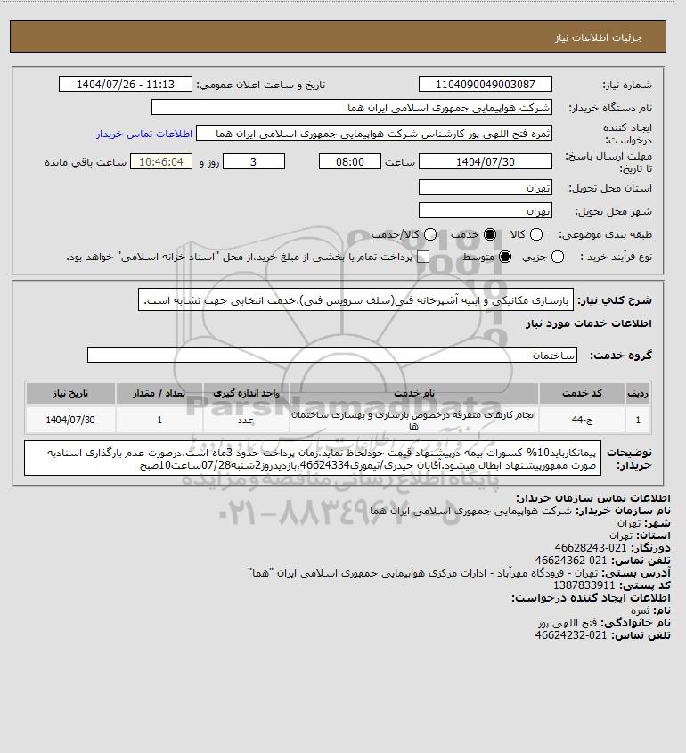 شرح کلی نیاز: بازسازی مکانیکی و ابنیه آشپزخانه فنی(سلف سرویس فنی)،خدمت انتخابی جهت تشابه است.