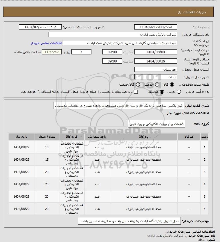 شرح کلی نیاز: فیوز باکس ساخت ایران تک فاز و سه فاز طبق مشخصات وابعاد مندرج در تقاضای پیوست .