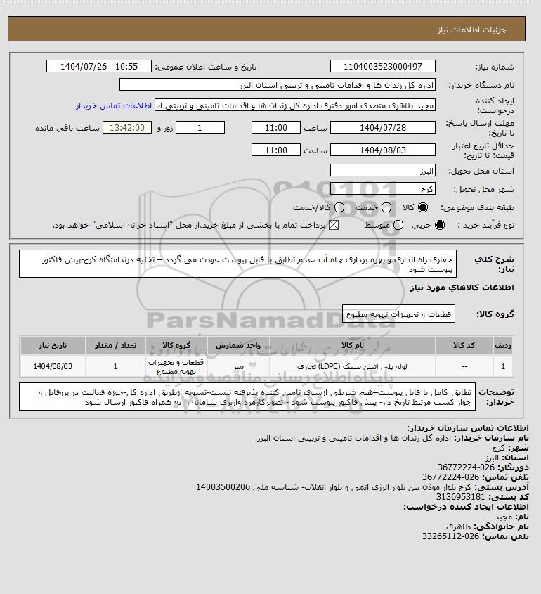 شرح کلی نیاز: حفاری راه اندازی و بهره برداری چاه آب ،عدم تطابق با فایل پیوست عودت می گردد – تخلیه درندامتگاه کرج-پیش فاکتور پیوست شود