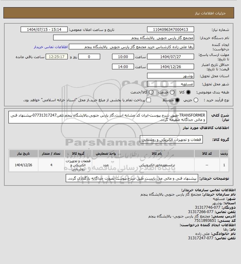 شرح کلی نیاز: TRANSFORMER-طبق شرح پیوست-ایران کد مشابه است.گاز پارس جنوبی،پالایشگاه پنجم،تلفن07731317247-پیشنهاد فنی و مالی جداگانه ضمیمه گردد.