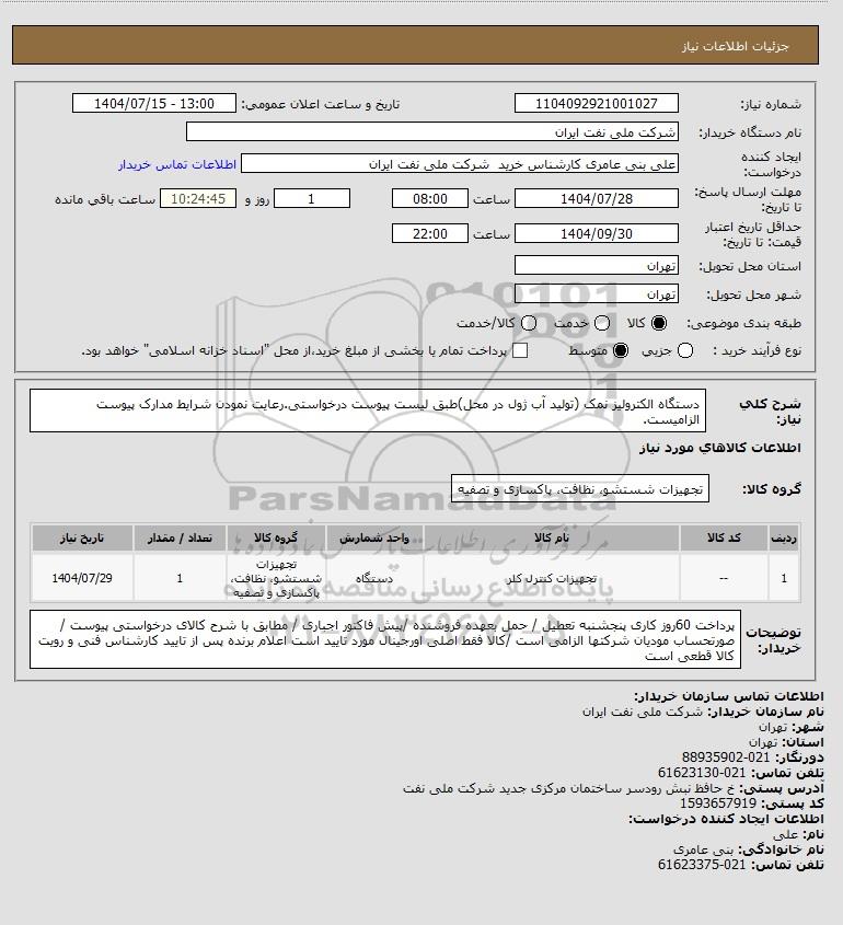شرح کلی نیاز: دستگاه الکترولیز نمک (تولید آب ژول در محل)طبق لیست پیوست درخواستی.رعایت نمودن شرایط مدارک پیوست الزامیست.