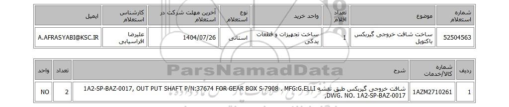 52504563ساخت شافت خروجی گیربکس باکتویل1ساخت تجهیزات و قطعات یدکیاستانی1404/07/26علیرضا افراسیابیA.AFRASYABI@KSC.IR