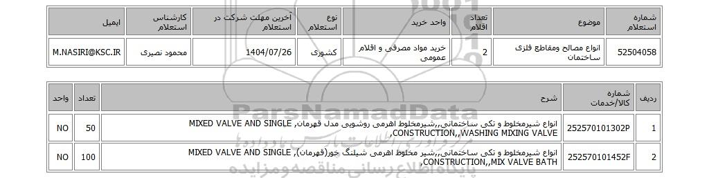52504058انواع مصالح ومقاطع فلزی ساختمان2خرید مواد مصرفی و اقلام عمومیکشوری1404/07/26محمود نصیریM.NASIRI@KSC.IR