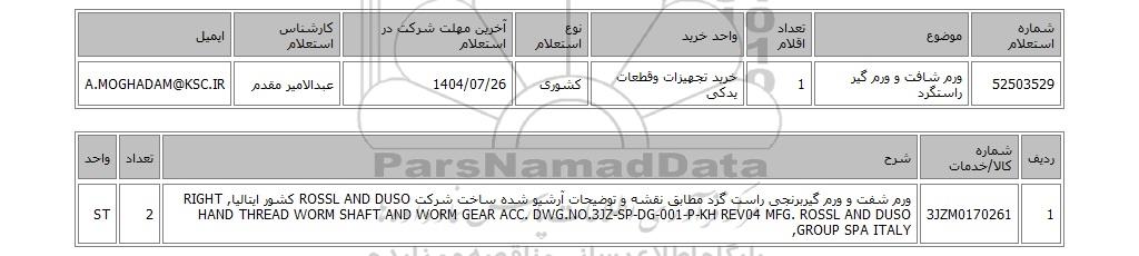 52503529 | ورم شافت و ورم گیر راستگرد | 1 | خرید تجهیزات وقطعات یدکی | کشوری | 1404/07/26 | عبدالامیر مقدم | A.MOGHADAM@KSC.IR |