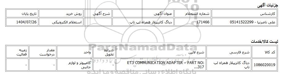 علی ناصرنیا - 05141522299 | 171466 | دیاگ کاترپیلار همراه لپ تاپ | استعلام الکترونیکی | 1404/07/26 |