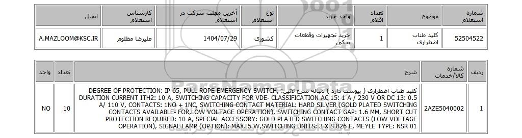 | 52504522 | کلید طناب اضطراری | 1 | خرید تجهیزات وقطعات یدکی | کشوری | 1404/07/29 | علیرضا مظلوم | A.MAZLOOM@KSC.IR |