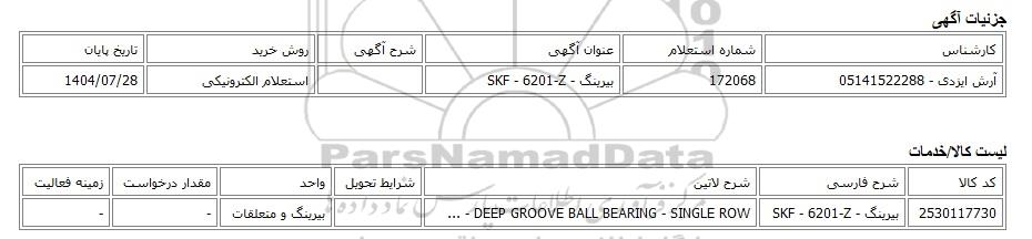 آرش ایزدی - 05141522288 | 172068 | بیرینگ - SKF - 6201-Z | استعلام الکترونیکی | 1404/07/28 |