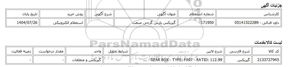 داود فدائی - 05141522289 | 171950 | گیربکس پارس گرجی صنعت | استعلام الکترونیکی | 1404/07/26 |