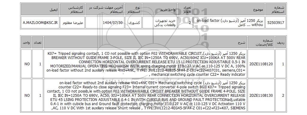 | 52503917 | بریکر 1250 آمپر (آرشیو دارد) on-load factor withou ... کامل | 2 | خرید تجهیزات وقطعات یدکی | کشوری | 1404/07/30 | علیرضا مظلوم | A.MAZLOOM@KSC.IR |