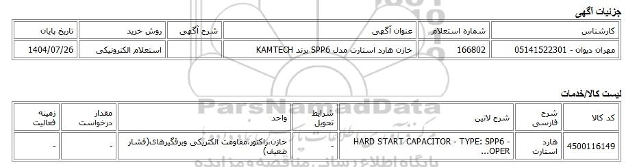 مهران دیوان - 05141522301 | 166802 | خازن هارد استارت مدل SPP6 برند KAMTECH | استعلام الکترونیکی | 1404/07/26 |