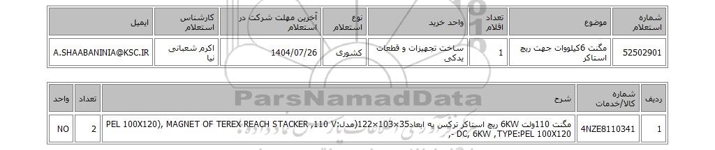52502901 | مگنت 6کیلووات جهت ریچ استاکر | 1 | ساخت تجهیزات و قطعات یدکی | کشوری | 1404/07/26 | اکرم شعبانی نیا | A.SHAABANINIA@KSC.IR |