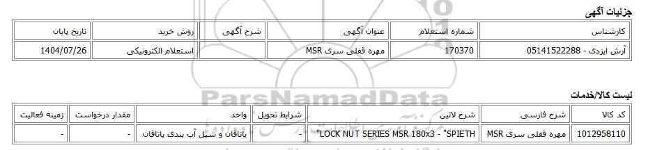 آرش ایزدی - 05141522288 | 170370 | مهره قفلی سری MSR | استعلام الکترونیکی | 1404/07/26 |