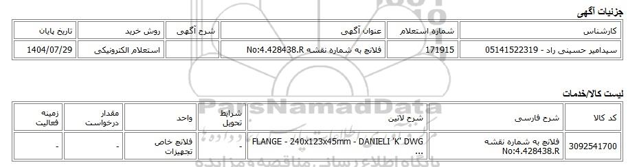| سیدامیر حسینی راد - 05141522319 | 171915 | فلانچ به شماره نقشه No:4.428438.R | استعلام الکترونیکی | 1404/07/29 |