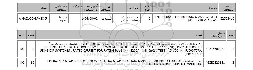 | 52503410 | استپ اضطراری & EMERGENCY STOP BUTTON, 220 V, 1NC+1 ... کامل | 2 | خرید تجهیزات وقطعات یدکی | کشوری | 1404/08/02 | علیرضا مظلوم | A.MAZLOOM@KSC.IR |