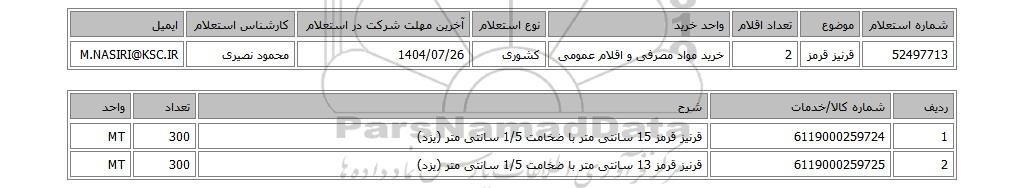 52497713 | قرنیز قرمز | 2 | خرید مواد مصرفی و اقلام عمومی | کشوری | 1404/07/26 | محمود نصیری | M.NASIRI@KSC.IR |