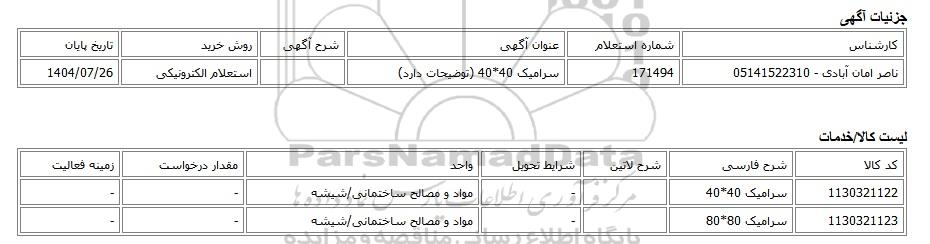 ناصر امان آبادی - 05141522310171494سرامیک 40*40 (توضیحات دارد)استعلام الکترونیکی1404/07/26