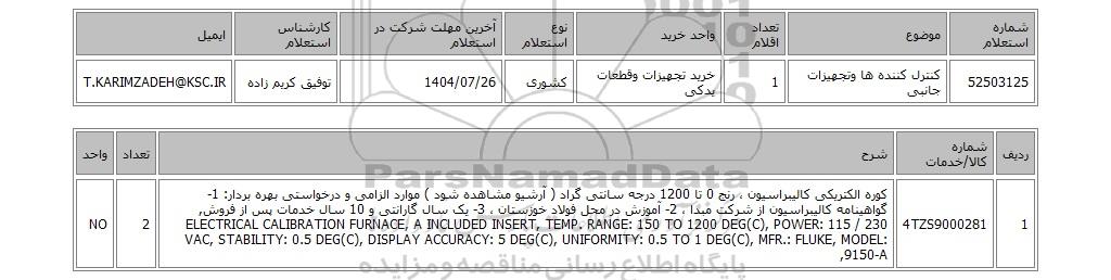 14TZS9000281کوره الکتریکی کالیبراسیون ، رنج 0 تا 1200 درجه سانتی گراد ( آرشیو مشاهده شود ) موارد الزامی و درخواستی بهره بردار: 1- گواهینامه کالیبراسیون از شرکت مبدا ، 2- آموزش در محل فولاد خوزستان ، 3- یک سال گارانتی و 10 سال خدمات پس از فروش, ELECTRICAL CALIBRATION FURNACE, A INCLUDED INSERT, TEMP. RANGE: 150 TO 1200 DEG(C), POWER: 115 / 230 VAC, STABILITY: 0.5 DEG(C), DISPLAY ACCURACY: 5 DEG(C), UNIFORMITY: 0.5 TO 1 DEG(C), MFR.: FLUKE, MODEL: 9150-A,2NO