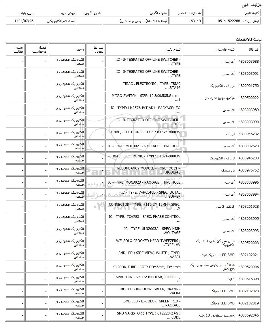 آرش ایزدی - 05141522288 | 163149 | نیمه هادی ها)عمومی و صنعتی) | استعلام الکترونیکی | 1404/07/26 |