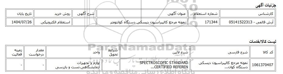 آرش قائمی - 05141522313 | 171344 | نمونه مرجع کالیبراسیون دیسکی دستگاه کوانتومتر | استعلام الکترونیکی | 1404/07/26 |