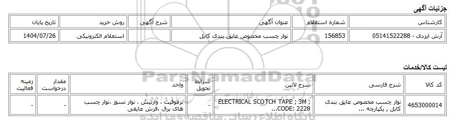 آرش ایزدی - 05141522288 | 156853 | نوار چسب مخصوص عایق بندی کابل | استعلام الکترونیکی | 1404/07/26 |