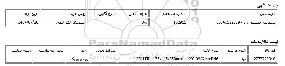 | 2773720340 | رول | ROLLER - 175x145x3500mm - KSC DWG No:PM6... | رول و رولیک | - | - |