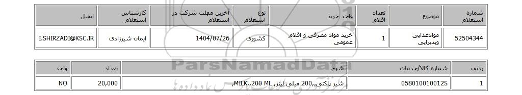 52504344 | موادغذایی وپذیرایی | 1 | خرید مواد مصرفی و اقلام عمومی | کشوری | 1404/07/26 | ایمان شیرزادی | I.SHIRZADI@KSC.IR |