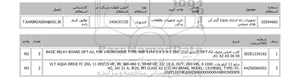52504662 | تجهیزات راه اندازی وانواع گرم کن های صنعتی | 2 | خرید تجهیزات وقطعات یدکی | کشوری | 1404/07/25 | توفیق کریم زاده | T.KARIMZADEH@KSC.IR |