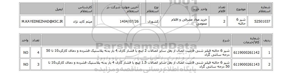 52501037 | شیر 6 حالته | 2 | خرید مواد مصرفی و اقلام عمومی | کشوری | 1404/07/26 | میثم کاید نژاد | M.KAYEDNEZHAD@KSC.IR |