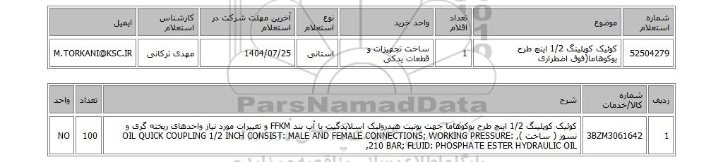 52504279 | کوئیک کوپلینگ 1/2 اینچ طرح یوکوهاما(فوق اضطراری | 1 | ساخت تجهیزات و قطعات یدکی | استانی | 1404/07/25 | مهدی ترکانی | M.TORKANI@KSC.IR |