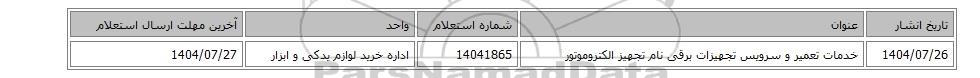 | 1404/07/26 | خدمات تعمیر و سرویس تجهیزات برقی نام تجهیز الکتروموتور | 14041865 | اداره خرید لوازم یدکی و ابزار | 1404/07/27 |