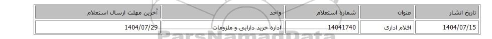 | 1404/07/15 | اقلام اداری | 14041740 | اداره خرید دارایی و ملزومات | 1404/07/29 |