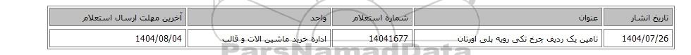 | 1404/07/26 | تامین یک ردیف چرخ تکی رویه پلی اورتان | 14041677 | اداره خرید ماشین الات و قالب | 1404/08/04 |