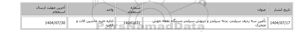 | 1404/07/17 | تأمین سه ردیف سیلندر، بدنه سیلندر و درپوش سیلندر دستگاه نقطه جوش متحرک | 14041631 | اداره خرید ماشین الات و قالب | 1404/07/30 |