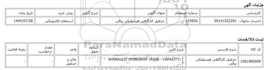 احسان چابوک - 05141522291 | 170920 | جرثقیل کارگاهی هیدرولیکی برقی | استعلام الکترونیکی | 1404/07/28 |
