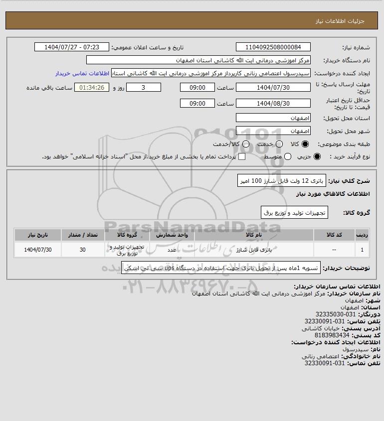 | 1 | -- | باتری قابل شارژ | عدد | تجهیزات تولید و توزیع برق | 30 | 1404/07/30 |