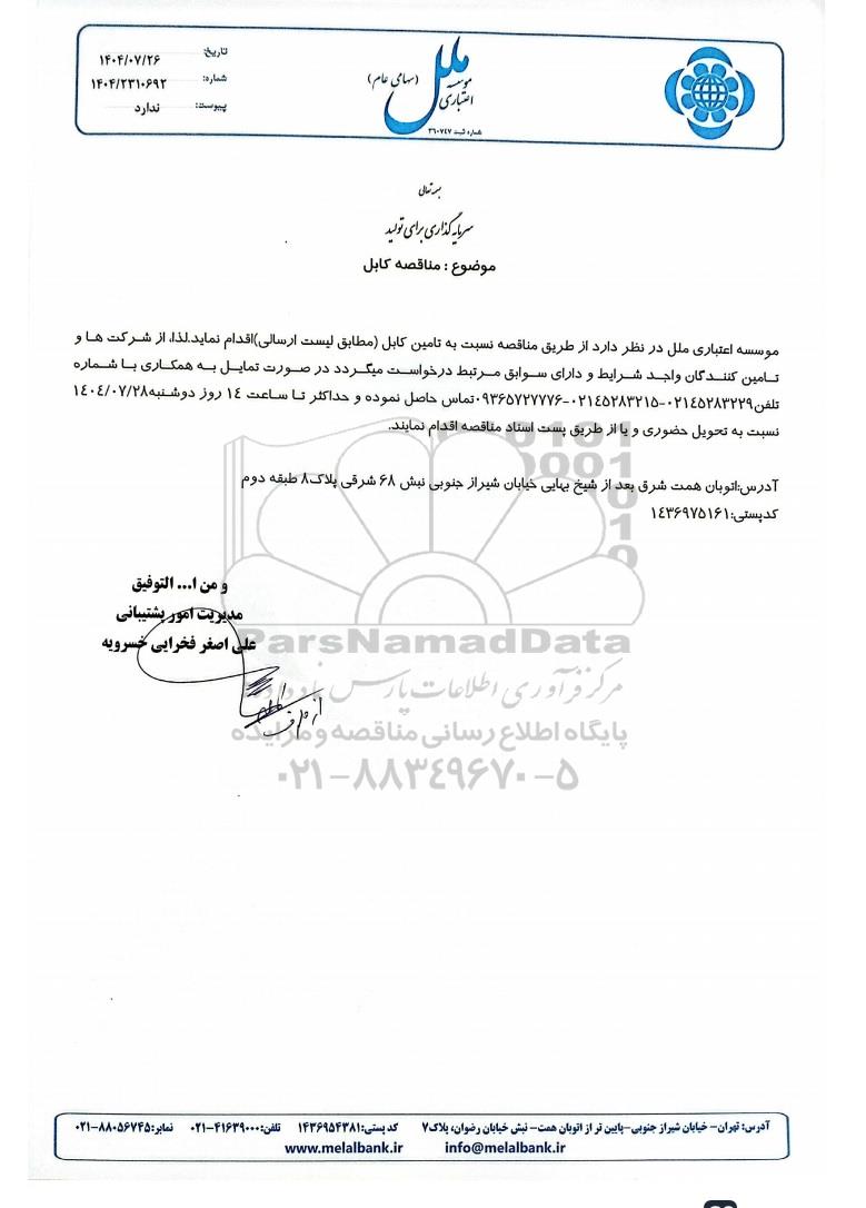 موسسه اعتباری ملل در نظر دارد از طریق مناقصه نسبت به تامین کابل (مطابق لیست ارسالی) اقدام نماید لذا ،از شرکت ها و تامین کنندگان واجد شرایط و دارای سوابق مرتبط درخواست می گردد در صورت تمایل به همکاری با شماره تلفن 02145283229 - 02145283215 - 09365727776 تماس حاصل نموده و حداکثر تا ساعت 14 روز دوشنبه 1404.07.28 نسبت به تحویل حضوری و یا از طریق پست اسناد مناقصه اقدام نمایند.