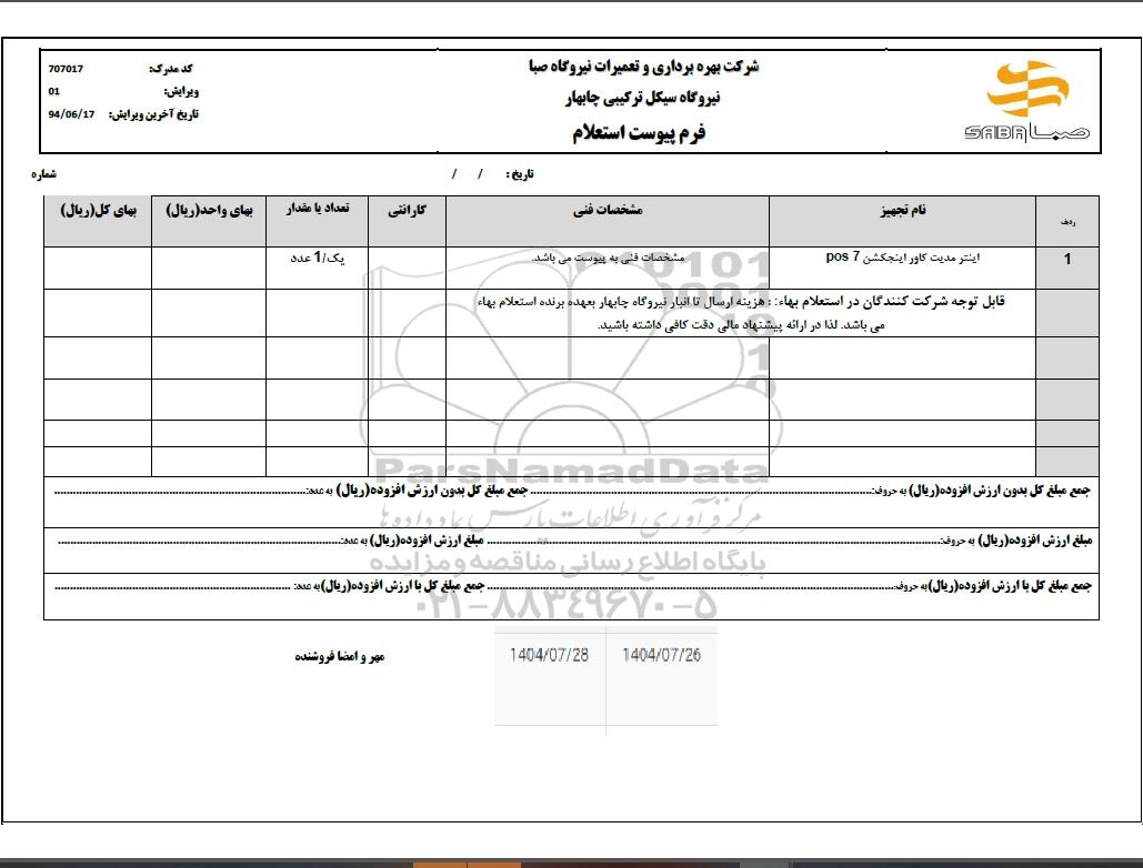 استعلام بها و موضوع استعلام استعلام اینتر مدیت کاور اینجکشن POS7 به اطلاع کلیه شرکتها و افراد متخصص واجد شرایط میرساند، آگهی گذار در نظر دارد از طریق استعلام بها، نسبت به انتخاب و دریافت پیشنهادات اقدام نماید. این استعلام با کد آگهی ثبت شده در سامانه خبرگزاری پارس نماد : 9716488 منتشر شده است. مشخصات استعلام : تاریخ شروع استعلام: 1404/07/26 آخرین مهلت ارسال پیشنهاد قیمت : 1404/07/28 و محل اجرای پروژه : استان سایر میباشد. استعلام قیمت مورد درخواست : استعلام اینتر مدیت کاور اینجکشن POS7 با دستهبندیهای تخصصی و گروه های مرتبط : نیروگاه, تجهیزات و ماشین آلات صنعتی, تجهیزات برق و الکترونیک, استعلام اطلاع رسانی میگردد. شرایط شرکت در استعلام آنلاین : ابتدا ثبت نام در سامانه استعلام پارس نماد و تکمیل مدارک موردنیاز و بارگذاری در سامانه رعایت تمامی ضوابط و الزامات مندرج در اسناد استعلام است.