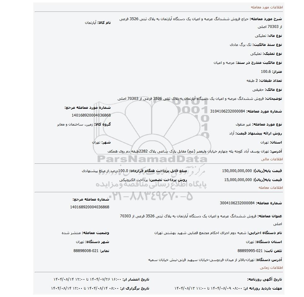 | شرح مورد معامله: حراج فروش ششدانگ عرصه و اعیان یک دستگاه آپارتمان به پلاک ثبتی 3526 فرعی از 70303 اصلی | نام کالا: آپارتمان | |