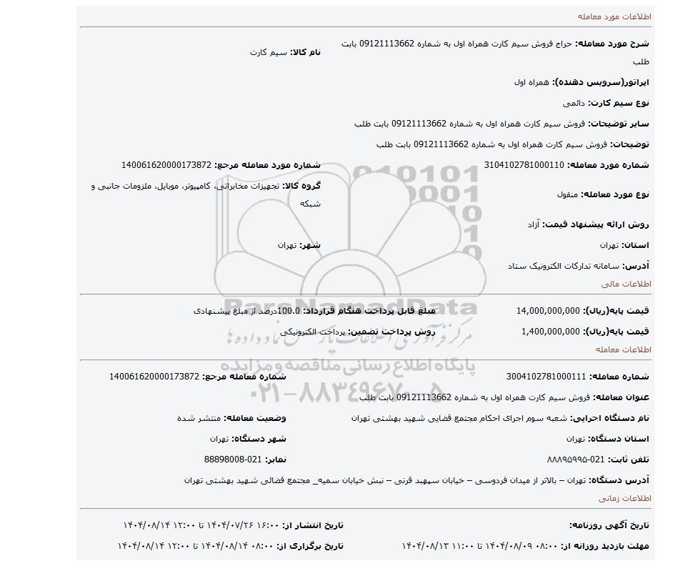 | عنوان معامله: فروش سیم کارت همراه اول به شماره 09121113662 بابت طلب | ||