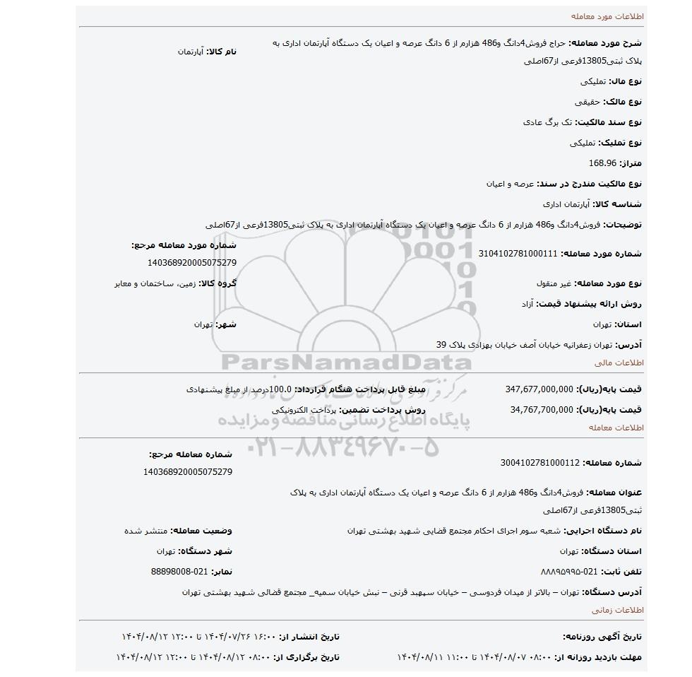 شرح مورد معامله: حراج فروش4دانگ و486 هزارم از 6 دانگ عرصه و اعیان یک دستگاه آپارتمان اداری به پلاک ثبتی13805فرعی از67اصلی نام کالا: آپارتمان
