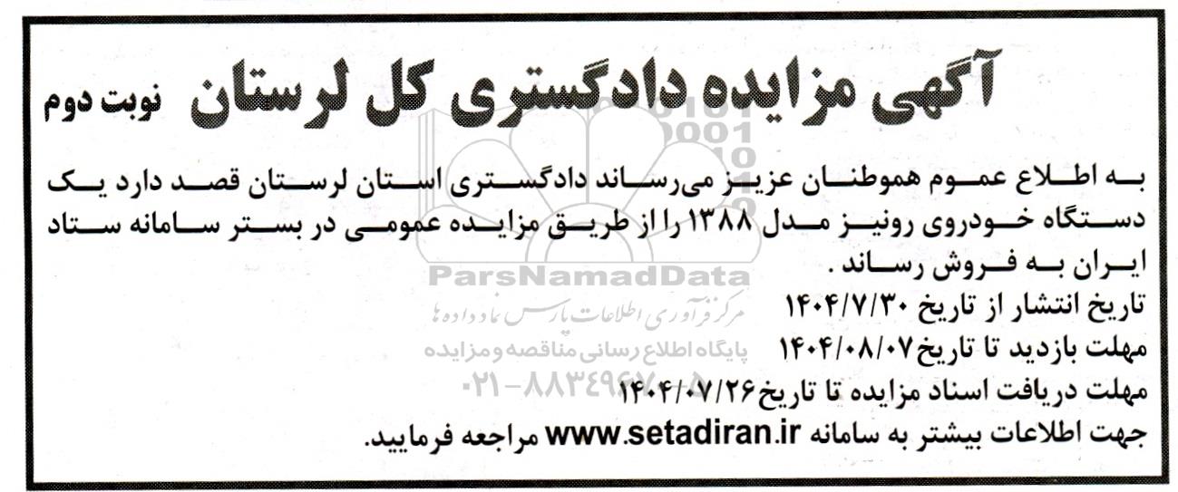 به اطلاع عموم هموطنان عزیز میرساند دادگستری استان لرستان قصد دارد یک دستگاه خودروی رونیز مدل 1388 را از طریق مزایده عمومی در بستر سامانه ستاد ایران به فروش رساند .