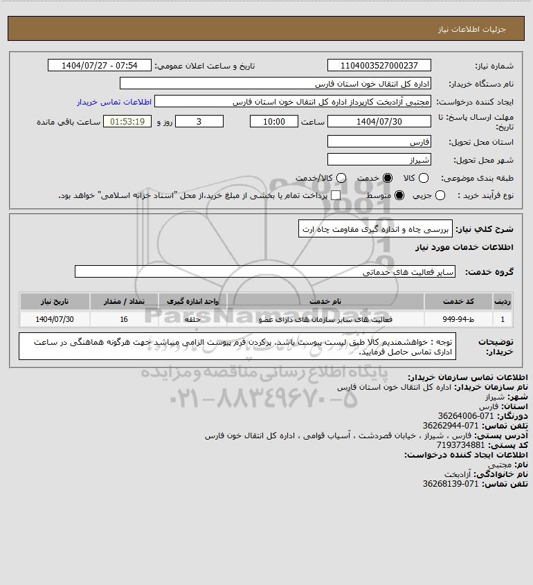 شرح کلی نیاز: بررسی چاه و اندازه گیری مقاومت چاه ارت