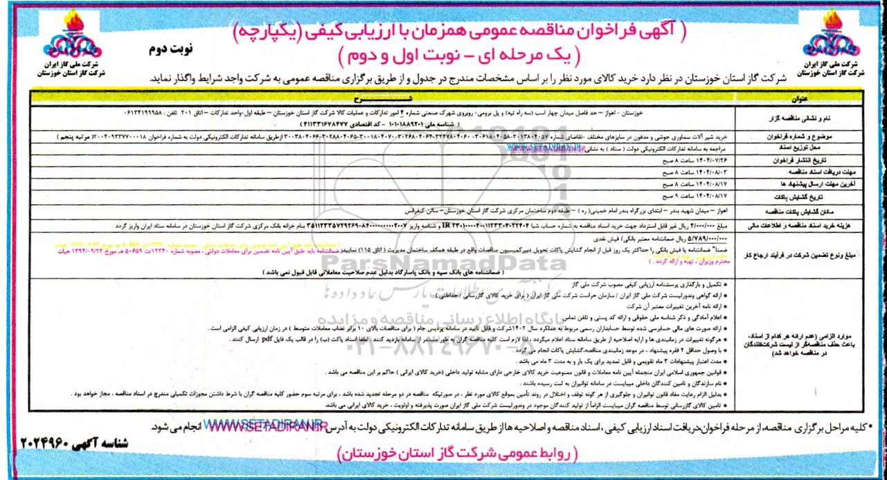 شرکت گاز استان خوزستان در نظر دارد خرید کالای مورد نظر را بر اساس مشخصات مندرج در جدول و از طریق برگزاری مناقصه عمومی به شرکت واجد شرایط واگذار نماید.